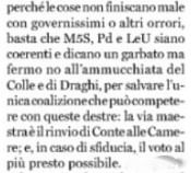 I grillini volevano insomma non un nuovo governo ma un rimpasto limitatissimo di quello ormai caduto. Ora anche loro, come tutta la politica, si trovano in qualche modo commissariati nelle condizioni d’emergenza del Paese.