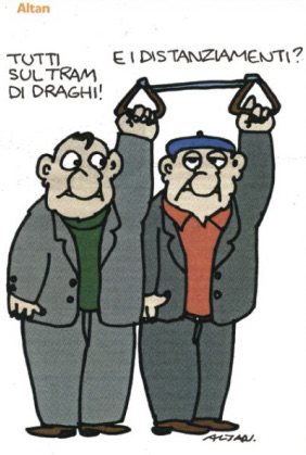 Formidabile quell’Altan, sulla prima pagina di Repubblica, che reclama in questi tempi di epidemia virale i distanziamenti sul tram affollato di Mario Draghi. Il povero Sergio Mattarella al Quirinale si sentirà un po’ in colpa per avere messo nella circolazione politica un mezzo così pericoloso per i