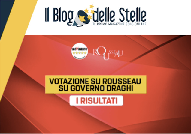 Davide Casaleggio, pur avendo tenuto ad annunciare di persona i risultati del referendum svoltosi sul nascente governo Draghi attraverso la piattaforma Rousseau di cui solo lui ha le chiavi, si è dimenticato di metterli ben visibili nella copertina del blog ufficiale delle Stelle. Dove per leggerli bisogna scorrere in basso la pagina e trovarli fra le righe senza un particolare risalto.