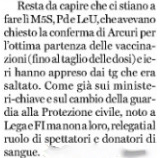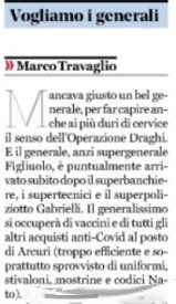 straordinario per l’emergenza virale. La notizia, giustamente sottolineata nel titolone di prima pagina di Repubblica, sta nel ricorso da parte del governo a “un generale”: cosa che da sola basta e avanza a dare l’idea della svolta impressa nella gestione della pandemia da un Mario Draghi per giorni e giorni rappresentato da chi non ne ha mai digerito l’arrivo a Palazzo Chigi come un uomo destinato a vivere di rendita delle scelte e dell’azione del predecessore Giuseppe Conte. Che sarebbe stato ingiustamente sostituito nel bel mezzo della sua meritoria impresa.