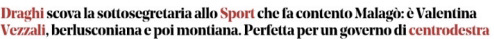 dal presidente del Consiglio di nominare sottosegretaria allo Sport Valentina Vezzali, “berlusconiana e poi montiana”, perciò “perfetta per un governo di centrodestra”. E così è anche servito, a suo modo, Beppe Grillo per avere accettato pure lui Draghi a Palazzo Chigi trovando subito un posto politico al… deposto Giuseppe Conte: “rifondatore” del MoVimento 5 Stelle, o come diavolo esso potrà chiamarsi alla fine.