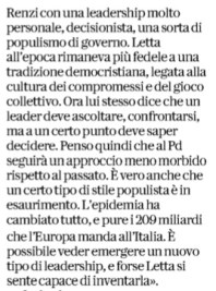 fame di “poltrone”, Enrico Letta è atteso alla prova del “nuovo Pd” -testuale- che ha promesso tornando alla politica dall’insegnamento esercitato a Parigi. Dove il suo dichiarato e compiaciuto sponsorizzatore Marc Lazar in una intervista a Repubblica ha raccontato che l’amico è davvero maturato, unendo alla competenza e a tante altre virtù anche quel tocco di decisionismo che occorre pure in politica. E della cui mancanza probabilmente profittò sette anni fa Renzi per disarcionarlo.