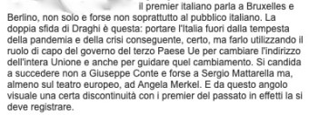 Draghi “si candida a succedere non a Giuseppe Conte e forse a Sergio Mattarella ma, almeno sul teatro europeo, ad Angela Merkel”, ormai arrivata per sua stessa scelta al capolinea dopo una così lunga e sostanziale guida. “E da questo angolo visuale -ha insistito Delgado- una certa discontinuità con i premier del passato in effetti la si deve registrare” a vantaggio di Draghi.