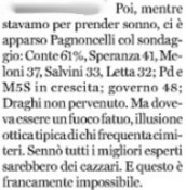 Opposta ma patetica -direi- è la valutazione del solito Marco Travaglio. Che sul suo Fatto Quotidiano ha tonicamente perduto il sonno, che gli procura il presidente del Consiglio, leggendo il sondaggio fresco