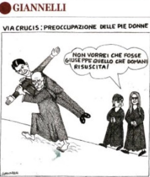 Ironia a parte, naturalmente, non hanno poi tutti i torti quelle due donne che Enrico Letta ha appena fatto eleggere alla presidenza dei gruppi parlamentari del Pd a preoccuparsi -nella vignetta di Emilio Giannelli sulla prima pagina del Corriere della Sera- sul tipo di Via Crucis celebrato venerdì santo dallo stesso Letta. Che, avvolto in un saio, e rigorosamente scalzo, si porta sulle spalle lungo la salita del Golgota il Conte appeso al nulla del discorso con cui ha esordito su Facebook come capo del MoVimento 5 Stelle. Le penitenti si chiedono, in particolare più la deputata Debora Serracchiani parlandone con la senatrice Simona Malpezzi, se non sia “Giuseppe”, cioè Conte, piuttosto che Enrico, cioè Letta, l’uomo destinato alla Resurrezione.