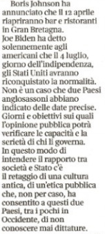 Fuori una data, quindi, illustrissimo presidente del Consiglio Draghi. E basta con le chiacchiere, i sorrisi, i rimbrotti, i moniti, tradotti nel solito felice titolo dal manifesto, a chi salta la fila o, sul versante opposto, rifiuta il vaccino che gli capita a sorte perché non se ne fida. Ma le persone serie, caro Walter, non giocano con le date come ai dadi, perché il covid è maledettamente più serio, più pericoloso persino di quel disgraziato di Hitler e dei suoi successori o imitatori di turno in carne e ossa che ogni tanto spuntano lontano e persino vicino a noi. Qui ci vogliono persone serie, responsabili, non scommettitori, alla faccia pure -se permetti, caro Walter- di Joe Biden e Boris Jhonson, questa volta in ordine rigorosamemte alfabetico dei loro cognomi.