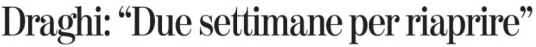 Uno legge il titolo di apertura di un giornale mica da poco, un giornalino o giornaletto di provincia, ma della Stampa, che Giuseppe Conte ha appena scoperto come la nave ammiraglia -altro che Repubblica– della flotta di carta degli eredi di Gianni Agnelli schierata con “troppo zelo” a favore di Mario Draghi, e non crede ai propri occhi stropicciandoseli. Vengono attribuite al presidente del Consiglio queste testuali parole, con tanto di virgolette che non dovrebbero lasciare dubbi e potrebbero suonare come la vittoria dei dimostranti tornati ieri in piazza a reclamare la riapertura un po’ di tutto’per non essere sequestrati a vita dalla pandemia: “Due settimane per riaprire”.