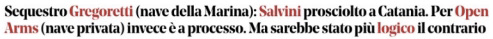 Lo stesso Fatto Quotidiano, che non può certamente essere considerato un giornale prevenuto contro magistrati e Magistratura, pur con caratteri simili a quelli di un bugiardino che troviamo nelle confezioni dei medicinali, ha commentato così in prima pagina il processo che l’ex ministro leghista dell’Interno ha evitato a Catania e quello che lo aspetta invece a settembre a Palermo per questioni di migranti a bordo di navi condotte verso i porti italiani: “Sequestro Gregoretti (nave della Marina): Salvini prosciolto a Catania. Per Open Arms (nave privata) invece è a processo. Ma sarebbe stato più logico il contrario”. Peraltro, le due navi si erano mosse con i loro carichi nello stesso anno e nella stessa stagione estiva: 2019.