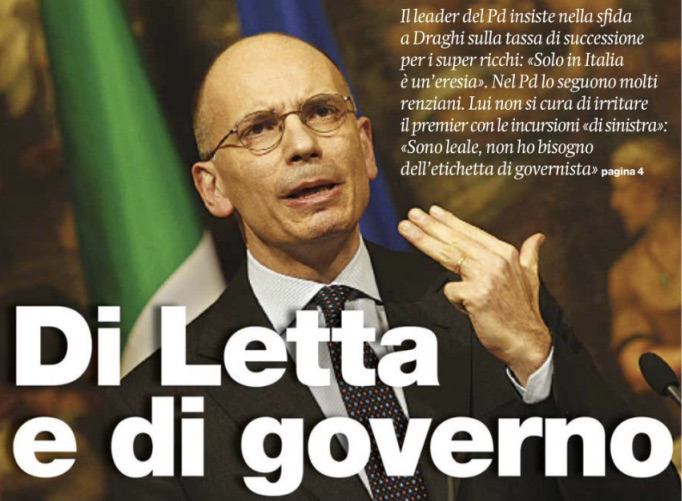 C’è qualcosa che evidentemente non ha funzionato e non funziona nella gestione mediatica e politica di questa faccenda che sembrava avere creato due giorni fa un clamoroso conflitto tra Letta e Draghi, o viceversa, solo apparentemente attenuato da una “cordiale” e “lunga” telefonata fatta dall’uno all’altro compromettendone un’agenda fitta di appuntamenti alquanto importanti. E’ accaduto che al manifesto per ragioni politiche, di orario o non so cos’altro non hanno voluto o potuto accorgersi della partita nel frattempo truccata dal segretario del Pd, e non dal Draghi travestito sul Fatto Quotidiano da prestigiatore. La soglia del valore patrimoniale di un milione di euro inizialmente indicata da Letta per proporre una maggiore e progressiva tassazione sull’eccedenza è stata spostata a cinque milioni di euro: direi anche ragionevolmente spostata, perché con la nuova soglia è forse più giusto parlare dei “ricchi”, come li ha definiti il segretario del Pd, ai quali poter chiedere qualcosa di più.