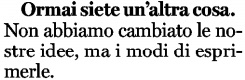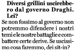 D’altronde, “se non fossimo al governo -ha spiegato al Fatto Quotidiano l’esaurito reggente Vito Crimi- non potremmo difendere i nostri temi e le nostre battaglie, e combattere certe derive. Se uscissimo cosa faremmo: dei sit-in?”. E anche sull’essere “ormai un’altra cosa”, come lamentato dall’intervistatore, il vice ministro Crimi ha frenato dicendo: “Non abbiamo cambiato le nostre idee, ma i modi di esprimerle”.