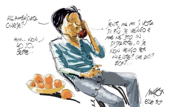 Nella vignetta Conte -sotto i cui governi i rapporti dell’Italia con Pechino sono andati ben oltre gli interessi e le aspettative del nostro principale alleato, cioè gli Stati Uniti- chiede a Grillo. “Senti, ma mi si vota di più se vengo e me ne sto in disparte, o se non vengo per niente? Che dici? Boh?…”. La sua scelta, come si sa, è stata poi di non andare, e di Grillo di andarci da solo, bastando e avanzando a rappresentare il Movimento affidato alla rifondazione cosmetica dell’ex presidente del Consiglio.