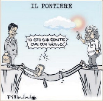 In quindici giorni, che ci porterebbero ad una settimana da una data fatidica che è il 25 luglio, giorno in cui Mussolini nel 1943 fu messo in minoranza nel Gran Consiglio del Fascismo e avviato alla deposizione e all’arresto; in quindici giorni, dicevo, potrebbe accadere di tutto e di più. Ad occhio e croce, senza farsi distrarre più di tanto dalle cerimonie di ascolto separato di Grillo e di Conte che qualcuno sta cercando di organizzare davanti ai parlamentari divisi fra l’uno e l’altro, non credo che possa reggere tanto quel ponte in cui il vignettista Nico Pillinini ha tradotto sulla Gazzetta del Mezzogiorno la situazione del MoVimento. E’ Luigi Di Maio steso fra due spuntoni di roccia con le mani minacciate da Conte e i piedi da Grillo e implorante verso l’ex presidente del Consiglio: “Io sto sia Con te che con Grillo”. Proprio da Conte peraltro il ministro degli Esteri è andato ieri per svolgere un tentativo di mediazione dall’esito assai incerto.