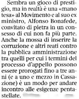 Il “gioco di prestigio” in qualche modo attribuito a Marta Cartabia anche da Giovanni Bianconi sul Corriere della Sera per “stendere la mano” ai grillini in sofferenza, che hanno resistito in Consiglio dei Ministri sino al classico ultimo momento prima di cedere, è consistito nel chiamare “improcedibilità” la prescrizione, sostanzialmente abolita dall’ex guardasigilli Alfonso Bonafede all’atto della sentenza di primo grado. E nell’equiparare la corruzione e la concussione ai reati più gravi, per i quali la improcedibilità, appunto, scatterebbe con tre anni infruttuosi di appello, anziché due, e diciotto mesi di passaggio infruttuoso in Cassazione, anziché un anno.