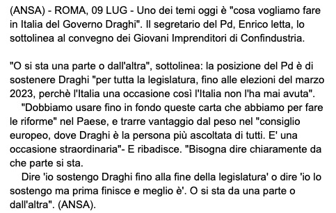 Il quadro del MoVimento 5 Stelle resta insomma confuso, a dir poco, anche dopo la presunta pace di Bibbona e l’altrettanto presunto “patto della spigola” o del “vermentino” su cui si sono sbizzarrite le cronache. Non a torto forse il Corriere della Sera ha sottolineato “differenze e ambiguità” sopravvissute al pranzo e al conto pagato peraltro non da Grillo, che pure poteva essere considerato il padrone d casa, disponendo di una villa sul posto, ma da Conte, che sembrava perciò l’ospite, appositamente giunto da Roma. Di “finta pace” ha parlato in un titolo La Stampa, di “sceneggiata” La Verità.