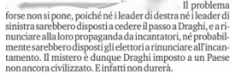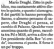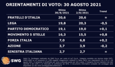 Questo 0,8 per cento in più di voti in meno di un mese è stato sbattuto in faccia dai nostalgici di Conte al solo 0,1 per cento guadagnato dal Pd e allo 0,2 di Forza Italia. Non parliamo poi dello 0,5 per cento in meno della Lega, che non ha fatto in tempo evidentemente a beneficiare dell’apprezzamento espresso dal governatore pugliese e piddino Michele Emiliano per Matteo Salvini, e dello 0,2 per cento in meno di Calenda. E pazienza -di nuovo- per quella “sinistra italiana” stabile al 2.7 e per i fratelli d’Italia di Giorgia Meloni stabili, in testa alla classifica generale, col loro 20,6 per cento. Si fa presto, come si vede, ad accontentarsi. Anzi, a cantare vittoria. Meno male -ripeto- che la 7 c’è, anche se c’entra fino ad un certo punto, non potendosi dubitare della Swg.