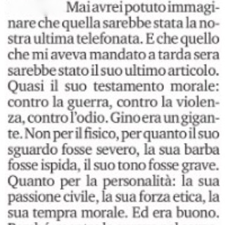 Raggiunto al telefono in quello che sarebbe stato il penultimo giorno della sua vita dall’amico e direttore della Stampa Massimo Giannini per la richiesta di un “racconto” dei sette anni da lui trascorsi in Afghanistan, a soccorrere le vittime di una guerra dall’esito secondo lui scontato contro chi l’aveva promossa oltre Atlantico, Gino Strada non esitò a rispondere sì. I fatti -tra la ritirata delle truppe occupanti e l’avanzata generalizzata dei talebani, ormai lanciati verso una Kabul simile alla Saigon del 1975- gli stavano così tragicamente dando ragione che quel racconto gli spettava di diritto. Ma, pubblicato ieri appunto come tale, con un sobrio richiamo in prima pagina, esso è diventato con la morte dell’autore il suo “testamento morale”, come ha scritto Giannini riaggiornandone metaforicamente il titolo.