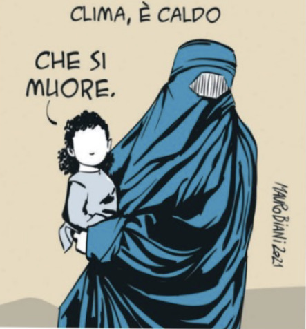 Purtroppo il Ferragosto di questo 2021 è e rimarrà segnato dalla tragedia afghana costituita dal ritorno dei talebani, ormai alle porte di una Kabul invasa da profughi che temo dovranno ancora provare il peggio. Ti prende lo sgomento a vedere la icastica vignetta di Mauro Biani su Repubblica, con quella bambina che dice di morire dal “caldo” in braccio alla madre avvolta nel burqa che tanto piace ai vincitori di una guerra ventennale condotta come peggio non si poteva da parte degli americani e loro alleati, fra i quali l’Italia, o la foto-copertina del manifesto. Che ripropone con quel titolo- Emergency- il grido del compianto Gino Strada, morto quasi di disperazione di fronte alla conferma della convinzione da lui espressa dal primo momento che quella guerra non avrebbe liberato niente e nessuno, ma solo aggiunto altro sangue a quello già versato.