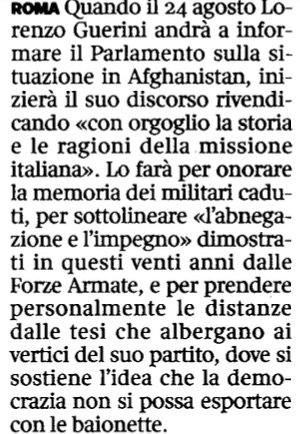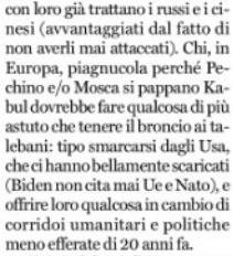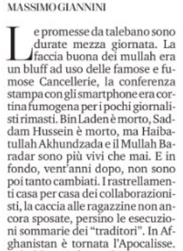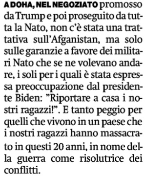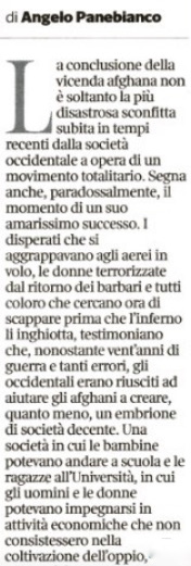 Crystal è insomma sopravvissuta al “massacro” del e nel suo Paese cui Luciana Castellina -scusate se ripeto ciò che le ho già contestato- ha accusato i “nostri ragazzi” di avere contribuito alternandosi nelle missioni dei militari occidentali. E, pur comprendendo la paura di chi, avendone evidentemente più di lei, scappa anche a costo di appendersi agli aerei che decollano per poi abbandonarsi nel vuoto e morire, ha pensato -ripeto anche questo- di potere e dover rimanere non solo e non tanto per testimoniare quanto per difendere ciò che le è stato insegnato e permesso nella sua giovane vita. Anziché fuggire ha preferito continuare a coltivare ciò che gli occidentali hanno “seminato” nel suo paese, lasciando quella che il presidente del Consiglio Mario Draghi ha definito “una traccia profonda nella società afghana”.