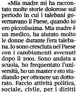 “Mia madre -ha raccontato Crystal- mi ha raccontato molte storie dolorose sul periodo in cui i talebani governavano il Paese, quando io ero piccolissima. Mia madre è un medico, ha aiutato molto le donne durante l’era talebana. Io sono cresciuta nel Paese con i cambiamenti avvenuti dopo il 2001. Sono andata a scuola, ho frequentato l’università, ho un master e sto studiando per ottenere un dottorato. Faccio attività politica, sociale, civile per i diritti”.