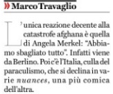 Di fronte all’immagine e alle parole di Crystak Bayat, alla quale auguro naturalmente tutto il bene di questo mondo, complimentandomi con la madre che ha saputo allevarla così bene, meglio ancora di quanto possano avere aiutato a farla le truppe di occupazione ritiratesi, trovo vomitevole -per ripetere un aggettivo che l’interessato usa spesso contro chi dissente da lui- ciò che ho letto proprio oggi di Marco Travaglio sul giornale che dirige.