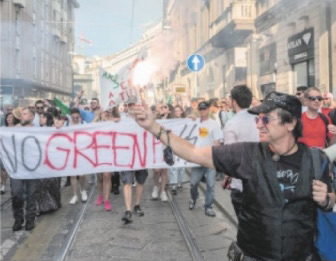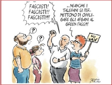Con la solita graffiante ironia il vecchio Sergio Staino sulla Stampa fa dire a un manifestante no vax, accanto ad uno che strilla contro i “fascisti”, che “neanche i talebani si permettono di obbligare gli afgani al green pass!!!”, da oggi invece obbligatorio in Italia sui mezzi di comunicazione a lunga distanza e nelle scuole.