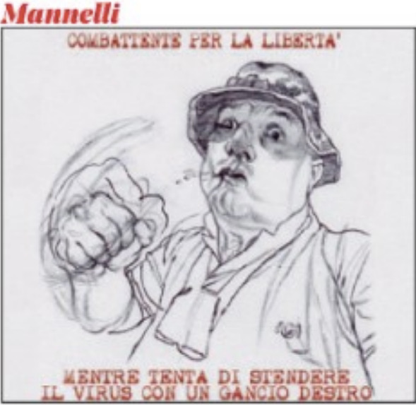 Ma, fra tutte, preferisco e segnalo, se mi permettete, la vignetta, sempre di prima pagina, del Fatto Quotidiano, che qualche volta -lo ammetto- riesce anche a sorprendere e a farsi dare ragione persino da me, non certo sospettabile di simpatie per le sue preferenze politiche e il suo modo di attaccare chi ne dissente. Riccardo Mannelli, ispirato dall’aggressione subìta da un giornalista durante una manifestazione davanti al Ministero della Pubblica Istruzione, identifica folle, movimento e quant’altro no vax in uno sprovveduto e bolso “combattente per la libertà mentre tenta di stendere il virus con un gancio destro”.