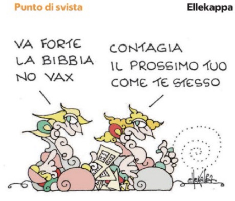 Trovo efficace anche la vignetta di Ellekappa, sulla prima pagina di Repubblica, in cui si attribuisce alla “Bibbia no vax” il comandamento di contagiare “il prossimo tuo come te stesso”.