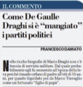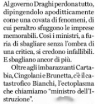 Per quanto basata su considerazioni e fatti indiscutibili, essendo evidente il ridimensionamento subìto dai partiti, con tutte le loro convulsioni interne, dall’azione di un governo guidato con autorevolezza e prestigio internazionale dall’ex presidente della Banca Centrale Europea, la rappresentazione di una quinta Repubblica italiana nata surrettiziamente può avere messo in qualche imbarazzo Mattarella. Una cui rielezione potrebbe rafforzare l’interpretazione della situazione politica e istituzionale espressa dall’editorialista del più diffuso giornale italiano, il Corriere della Sera. E che fa drizzare i capelli particolarmente ai nostalgici o ai sognatori di un ritorno di Giuseppe Conte a Palazzo Chigi tipo Marco Travaglio. Che proprio oggi sul suo quotidiano sogna una crisi provocata da una spaccatura della Lega fra Matteo Salvini e Giancarlo Giorgetti. E si lamenta nell’editoriale di una specie di giornalista collettivo che “al governo Draghi perdona tutto, dipingendolo apoditticamente come una covata di fenomeni, di cui peraltro sfuggono le imprese memorabili. Così i ministri, a furia di sbagliare senza l’ombra di una critica, si credono infallibili. E sbagliano ancora di più”: da “Cartabia, Cingolani, Brunetta” al “catastrofico Bianchi, l’ectoplasma che chiamiamo ministro dell’Istruzione”, scrive il direttore del Fatto.