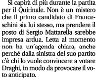 No. Questa volta Travaglio non è riuscito a digerire il fatto, minuscolo, che Bernabè abbia elogiato come più non si poteva il presidente del Consiglio in carica Mario Draghi, senza alcun imbarazzo per essere stato da lui appena nominato presidente delle Acciaierie d’Italia, senza mai neppure nominare, e tanto meno riconoscere qualche merito a chi lo ha preceduto a Palazzo Chigi. E ne è stato così barbaramente, incivilmente, ingiustamente, ignobilmente allontanato da meritarsi quel volumetto dello stesso Travaglio dal titolo di un giallo come “Conticidio”. Sto scrivendo naturalmente di Giuseppe Conte, non una ma due volte capo del governo nella storia recentissima della Repubblica italiana, uscito da Palazzo Chigi ancora fresco di energie e già dichiaratamente sfinito, o quasi, dalla fatica immane -lo riconosco anch’io- di presiedere il Movimento 5 Stelle sotto la vigilanza -pardon, la “garanzia”- di Beppe Grillo. Che dopo averlo designato a quella carica lo bocciò clamorosamente e pubblicamente come incapace e poi lo riabilitò facendogli pagare, come ogni buon genovese, il pranzo della riconciliazione, o del presunto chiarimento, in una trattoria sulla sabbia toscana di Marina di Bibbona. Dove di casa, intesa in tutti i sensi, anche come villa con tanto di stanze, servizi, cancello e utenze per la residenza estiva, non era però il pugliese Conte, ma il ligure Grillo.