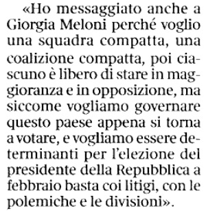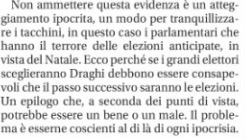 Contro Draghi, per quanto sostenuto al governo da Berlusconi e da più della metà del centrodestra, partecipe anzi della compagine ministeriale col Pd, i grillini e la sinistra dalemian-bersaniana, il Giornale e Libero si trovano oggi, minimizzando o criticando il G20 da lui presieduto, perché quanto meno infastiditi da una possibile ricaduta della sua performance internazionale sulla corsa al Quirinale, a danno di quella dalla quale Berlusconi ha detto di non volersi “tirare indietro”.
