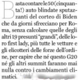 Del resto, come il più sprovveduto o indifferente abitante della Capitale, ciò che ha colpito di più Travaglio sono state “le 50 (cinquanta!) auto blindate sputazzanti del corteo di Biden che da giorni sfrecciano per Roma, senza calcolare quelle degli altri 19 presunti “grandi”, delle loro first lady, più tutte le vetture e gli elicotteri delle forze dell’ordine”: tutte cose che probabilmente il direttore del Fatto avrebbe sopportato meglio con Conte ancora a Palazzo Chigi, anziché fatto fuori politicamente a febbraio da una mezza congiura. “Conticidio”, ha chiamato quel cambio della guardia proprio Travaglio in un saggio, si fa per dire.