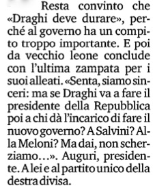 C’è della perfidia politica, ma anche un po’ personale, d’altronde comprensibile, nella reazione del direttore della Stampa Massimo Giannini allo sgarbo fattogli da Berlusconi dichiarandosi “frainteso”, o addirittura facendo smentire dal proprio staff di avergli rilasciato un’intervista per escludere, praticamente, che i due concorrenti della destra a Palazzo Chigi, Matteo Salvini e Giorgia Meloni, possano mai arrivarvi, almeno con un Draghi al Quirinale.