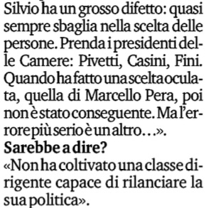 “Silvio -ha detto testualmente l’amico- ha un grosso difetto: quasi sempre sbaglia nella scelta delle persone. Prenda i presidenti delle Camere: Pivetti, Casini, Fini. Quando ha fatto una scelta oculata, quella di Marcello Pera, poi non è stato conseguente”, sino a perderselo per strada. “Ma l’errore più serio -ha continuato impietosamente Martino- è un altro….Non ha coltivato una classe dirigente capace di rilanciare la sua politica”. Di che cosa quindi lui può lamentarsi adesso?, è la domanda sottintesa a questo discorso.