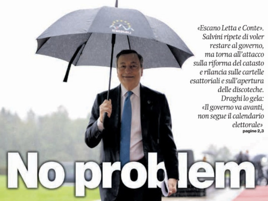 Ben protetto dell’ombrello, Mario Draghi procede spedito e sorridente sotto la pioggia, come nella foto che lo ha ripreso in Slovenia e che il manifesto ha voluto usare sulla sua prima pagina col titolo “no problem” per rappresentare la situazione politica italiana.