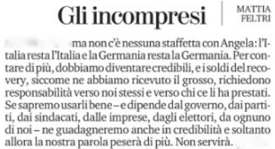 Per fortuna Draghi è un uomo dal sistema nervoso molto saldo, e razionale abbastanza da condividere la prudenza, chiamiamola così, del commento di Mattia Feltri. Che sulla Stampa ha invitato i lettori a ricordarsi che “l’Italia resta l’Italia e la Germania resta la Germania”. E soprattutto a tenere conto che “per contare di più dobbiamo diventare credibili” e che “i soldi del recovery, siccome ne abbiamo ricevuto il grosso, richiedono responsabilità verso noi stessi e verso chi ce l’ha prestati”, o persino regalati. Del resto, Draghi è stato mandato proprio per questo dal presidente della Repubblica a Palazzo Chigi, sostituendo un Conte che non era in condizioni politiche, e forse neppure personali, con tutto il rispetto che giustamente reclama, di garantire la ricerca e tanto meno il raggiungimento di questa necessaria responsabilità collettiva, diciamo così. Che dipende “dal governo, dai partiti, dai sindacati, dalle imprese, dagli elettori, da ognuno di noi”, come ha scritto il mio amico Mattia.
