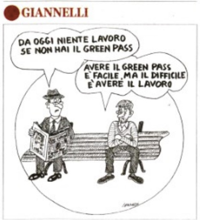 Il problema è che ancor più grave del presunto rischio di uscire dal mondo del lavoro è il pericolo di non uscire dalla pandemia virale, nella quale l’economia non avrà mai la possibilità di sviluppare tutte le sue potenzialità e di garantire finalmente un lavoro a chi non ce l’ha mai avuto o l’ha perso, spesso a causa dei danni procurati dal covid al sistema produttivo e sociale. Giustamente Emilio Giannelli nella sua vignetta di prima pagina del Corriere della Sera fa dire ad un disoccupato sulla solita panchina che “avere il green pass è facile, ma il difficile è avere il lavoro”, in risposta al signore che aveva tradotto così notizie e titoli di un giornale: “Da oggi niente lavoro se non hai il green pass”.