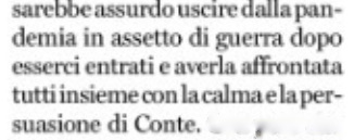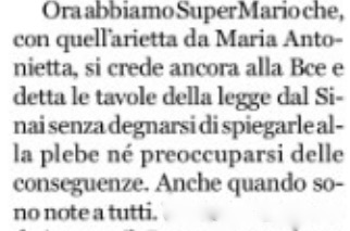 Sentite cosa non più tardi di ieri sul Fatto Quotidiano ha scritto nel suo editoriale, o direttoriale, il solito Marco Travaglio: “Sarebbe assurdo uscire dalla pandemia in assetto di guerra dopo esserci entrati e averla affrontata tutti insieme con la calma e la persuasione di Conte”. E ancora, risalendo sino a Mosè attraverso la rivoluzione francese del 1789, giusto per non farsi mancare niente: “Ora abbiamo SuperMario che, con quell’arietta da Maria Antonietta, si crede ancora alla Bce e detta le tavole della legge dal Sinai senza degnarsi di spiegarle alla plebe né preoccuparsi delle conseguenze, anche quando sono note a tutti”. Le famose brioches di Maria Antonietta, finita notoriamente sul patibolo, come gli sconti sui tamponi o gli incontri del presidente del Consiglio con i sindacati…