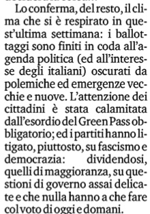 A dispetto della convinzione maturata da Alessandra Ghisleri che i disordini del 9 ottobre a Roma – con l’assalto dei forzanovisti alla sede nazionale della Cgil e tutte le esitazioni e contraddizioni delle reazioni dei leghisti e dei fratelli d’Italia di Giorgia Meloni- non fossero destinati a influire sul ballottaggio capitolino, penso che un peso l’abbiano avuto eccome.
