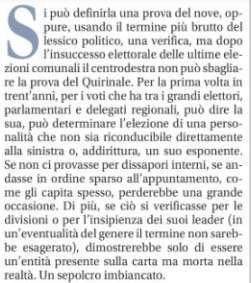 Infatti in un sondaggio effettuato il 20 ottobre dalla ghisleriana Euromedia Reasearch sulle intenzioni di voto a livello nazionale -a ballottaggi, quindi belli, che consumati, con tutto il “trionfo” vantato dal segretario del Pd Enrico Letta e tutta la “sconfitta” ammessa dal centrodestra- i rapporti di forza fra i vari partiti e schieramenti risultano cambiati di molto poco rispetto al sondaggio del 14 settembre, poco più di un mese prima. Segno che il grande sommovimento avvertito a Roma, per esempio, con la riconquista del Campidoglio da parte del Pd si deve alla circostanza tutta romana, appunto, di un candidato sbagliato dal centrodestra. Che ha lasciato a casa un bel po’ di elettori nel primo turno e ancora di più nel secondo.