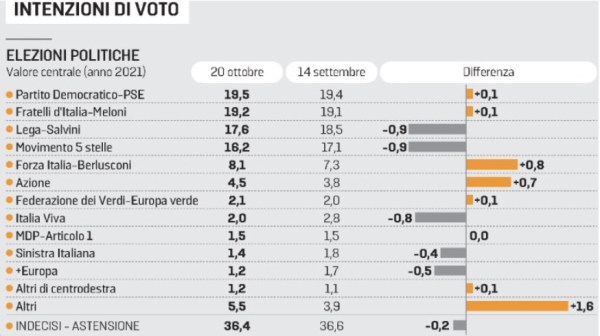 A livello nazionale la ricerca della Ghisleri ha confermato il Pd al 19,5 per cento delle intenzioni di voto, col guadagno di un misero 0,1 per cento rispetto al mese precedente, i fratelli d’Italia della Meloni al 19.2, anch’essi con un misero 0,1 per cento in più; la Lega di Matteo Salvini al 17,8 per cento, con lo 0,9 in meno, che non è cosa da strapparsi i capelli; il Movimento 5 Stelle al 18,2 per cento, con l’1,1 per cento in più che si spera non venga scambiato da Giuseppe Conte per l’11 per cento eliminando la virgola; Forza Italia all’8,1, con un aumento esattamente pari alla perdita della Lega, cioè sotto il punto; l’Italia Viva di Matteo Renzi al 2 per cento, con lo 0,8 per cento in meno; la sinistra di Bersani inchiodata all’1,5 per cento, la sinistra già vendoliana all’1,4 per cento, con lo 0,4 per cento in meno, l’Azione di Carlo Calenda al 4,5 per cento, con lo 0,7 per cento in più procuratosi grazie all’exploit di Roma. Dove l’ex ministro ha battuto da solo tutte le altre liste prese singolarmente e sorpassato la ormai ex sindaca grillina Virginia Raggi. Tanto rumor per nulla, verrebbe voglia di dire di fronte a simili, modeste variazioni di carattere nazionale.