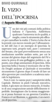 Certo è che fa una certa impressione vedere allineati giornali così opposti politicamente come La Verità di Maurizio Belpietro a destra e del Fatto Quotidiano a sinistra convergere su un giudizio assai negativo sul G20 pur di ridimensionare l’ornai quirinabile Draghi. Che sarebbe “sommerso dalla melassa per un nulla di fatto”, ha titolato Belpietro. “Il flop trionfale”, ha titolato il suo editoriale Marco Travaglio.