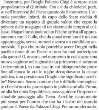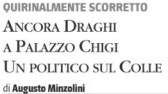 Che pacificazione ci sarebbe -ha chiesto proprio oggi Minzolini, tornando a scrivere della corsa al Quirinale ma evitando di polemizzare direttamente con Salvini, ignorato nel suo nuovo editoriale- se alla Presidenza della Repubblica dovesse arrivare uno come Draghi? Bravissimo, per carità, anche se reduce da un G20 un po’ troppo esaltato nelle sue conclusioni, ma rimasto rigorosamente estraneo alle lotte politiche della prima e della cosiddetta seconda Repubblica. Sarebbe l’ora di un politico, non di un tecnico, al Quirinale: E di un politico -ripeto- con le cicatrici della guerra politica addosso. “Avrebbe sicuramente più senso per l’uomo che ora ha i favori del mondo guidare il Paese da Palazzo Chigi per ammodernarlo”, ha concluso il direttore del Giornale. Che meglio non avrebbe forse potuto sostenere -gli va riconosciuto considerando i limiti formali dei poteri del capo dello Stato in una Repubblica ancora parlamentare- una corsa dalla quale Berlusconi non ha ancora ritenuto di “tirarsi indietro”, per restare al suo linguaggio usato non credo a caso, avendo egli maturato una certa esperienza anche in politica.