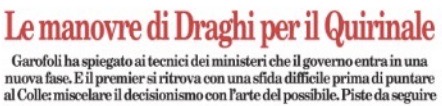 Persino il buon Draghi in questa situazione ha dovuto rallentare il passo facendo spiegare dal suo sottosegretario di fiducia Roberto Garofali agli alti burocrati dei vari Ministeri, secondo le anticipazioni del Foglio, che il governo entra forzatamente “in una nuova fase”: non dico “spiaggiato” -come lo rappresenta impietosamente il manifesto sulla sua prima pagina giocando con la questione delle concessioni demaniali agli stabilimenti balneari contestate dall’Unione Europea perché prive di gara- ma quasi sulla sabbia della corsa al Quirinale, in cui Draghi è ormai coinvolto.