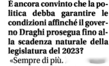 Tracce invece della preoccupazione che Draghi per imprudenza sua o di qualche cattivo consigliere si lasci distrarre dal prezioso lavoro di governo si trovano, laconiche e forti, in un’intervista di Silvio Berlusconi al direttore del Giornale di famiglia raccolta dal direttore in persona Augusto Minzolini. Al quale, desideroso giustamente di sapere, dopo le tante e solite note stonate che escono dall’orchestra del centrodestra, se sia “ancora convinto, che la politica debba garantire le condizioni affinchè il governo Draghi prosegua fino alla scadenza naturale della legislatura del 2023”. Berlusconi ha risposto: “Sempre di più”. Neppure Tacito sarebbe stato così preciso e breve.
