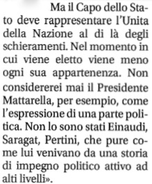 In pratica, pur fingendo di non parlare direttamente di sé e tanto meno degli avversari che hanno già mobilitato contro una sua candidatura tutto il materiale giudiziario e paragiudiziario possibile, facendone un mezzo latitante a piede libero e luccicante, Berlusconi è paragonato al presidente uscente della Repubblica e ai predecessori Einaudi, Saragat e Pertini, sapientemente selezionati come personalità liberatesi della loro appartenenza politica con l’elezione a capo dello Stato: diversamente da quanto accaduto -si dovrebbe intendere, salvo equivoci, da Enrico De Nicola, Giovanni Gronchi, Giovanni Leone, Francesco Cossiga, Carlo Azeglio Ciampi e Giorgio Napolitano. Sei sospetti, a dir poco, contro quattro insospettabili nella galleria quirinalizia dell’ex presidente del Consiglio.