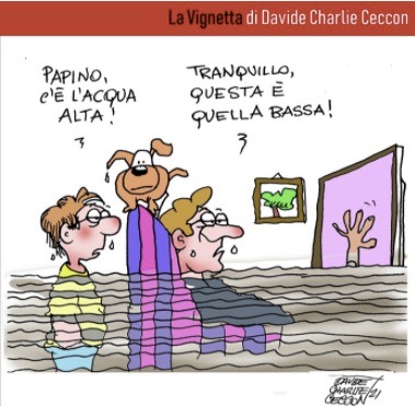 Ma è inutile cercare conferma di questi spifferi -anch’essi- sul blog personale del garante del MoVimento 5 Stelle perché vi dominano altri argomenti e timori, in una visione peraltro ironicamente fiduciosa come quella della vignetta in cui il “papino” tranquillizza il figliolo preoccupato della casa allagata. L’acqua è ancora bassa potendosi vedere ancora un po’ di televisore, un quadro appeso a una parete. Ma soprattutto si respira ancora senza l’attrezzatura del sommozzatore.