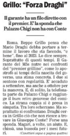 A questo fuoco di sbarramento i pur amici del Foglio – che hanno in qualche modo avviato la campagna per Draghi al Quirinale preferendo i sette anni certi del Colle ai due ancora a Palazzo Chigi, che sono poi poco più di un anno, e chissà poi- hanno aggiunto quello in verità silenzioso di Beppe Grillo, convinto pure lui che “Draghi debba portare a termine il lavoro che sta facendo, e bene, fino al 2023”. Per fortuna la “regolarità” dei contatti di Draghi con Grillo sarebbe maggiore di quella con Giuseppe Conte, un po’ ondivago anche in questo.