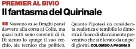 Tra le notizie o gli spifferi dal Fronte del Quirinale si distinguono oggi le poche righe di prima pagina del manifesto in cui, pur riferendo in verità da Palazzo Chigi, si assicura che “nessuno sa se Draghi pensi davvero alla corsa al Colle ma quasi tutti sono convinti di sì. Di sicuro -continua lo spiffero- lo spinge il suo cerchio, sia tecnico che politico. Quanto l’ipotesi sia considerata realistica e temibile lo dimostra il fuoco di sbarramento preventivo che s è levato da un po’ di giorni”.