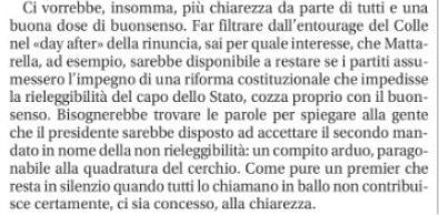 E quali sono queste voci, un po’ derise dal buon Augusto Minzolini per il loro carattere apparentemente paradossale? Se richiesto veramente da tutti di restare ancora un po’ al suo posto, come accadde nel 2013 col predecessore Giorgio Napolitano, il presidente uscente acconsentirebbe in cambio dell’impegno generale di approvare nell’anno residuo della legislatura una modifica della Costituzione che vieti la rieleggibilità del capo dello Stato e abolisca al contempo il cosiddetto semestre bianco, il divieto cioè di sciogliere le Camere nella parte conclusiva del mandato quirinalizio. E ciò che in passato avevano inutilmente proposto dal Quirinale i democristiani Antonio Segni e Giovanni Leone. Potrebbe essere in effetti l’uovo di Colombo, evidentemente indigesto però al Giornale, ripeto, della famiglia Berlusconi. Per oggi è tutto. Domani sarà un altro giorno.