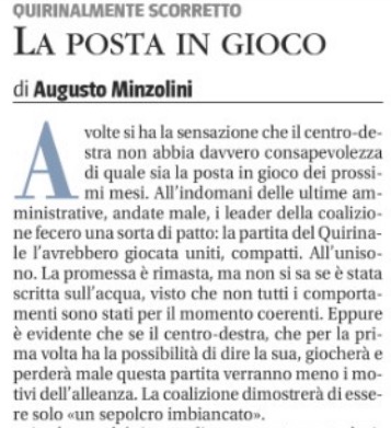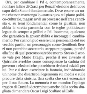 Proprio nel paragonarlo a Craxi e allo sfortunato epilogo della sua carriera politica il direttore del Giornale con grande astuzia politica, considerando interessi, ambizioni e quant’altro del suo editore, ha ammonito Renzi a non ripetere l’errore compiuto da Craxi nelle elezioni presidenziali del 1992, quando già il clima politico era intossicato dal mix di cronaca politica e giudiziaria sull’inchiesta della Procura di Milano, e simili, contro il finanziamento illegale dei partiti e la presunta ma non sempre provata corruzione.